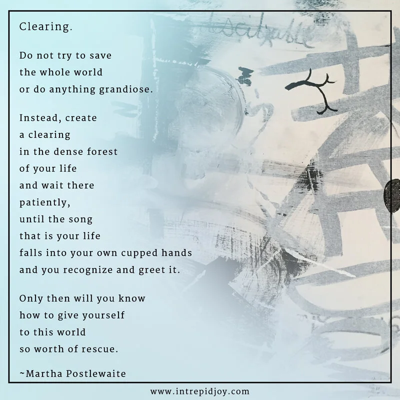 I created this image with this beautiful quotation as a part of my intrepid joy series several months ago. If you look at the image, the subtle message inside is a plug and a plot for you to claim the freedom you crave. Now, as we are approaching the sixth week of our “Shelter at Home” mandate, I find these words and image more clarifying and relevant than ever. The truth is, I’ve spent years thinking about the clearing I’ve been craving. Thinking like this never gets me any useful traction. As I reflect, it was never about the time I thought I needed. It was about claiming the stillness that helps me access my clarity.